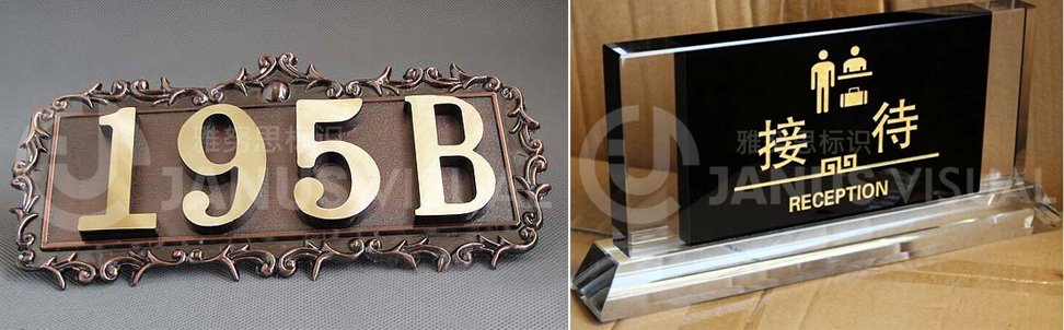 酒店標識牌是一種應用于酒店的廣告標牌。酒店標識系統是根據酒店整體設計風格為導向,綜合解決酒店方向性引導,視覺識別等運行功能為前提配合酒店整體工程項目實施的其中一部分工程。主要用以突出酒店的風格特色,主要制作材質以紅木、金屬(銅、鐵、鋁、錫、鈦金、不銹鋼)為主,制作工藝較為復雜,選用材質也很多。按照功能來劃分,酒店標牌分大堂指示牌(如收銀)、樓層指示牌、門號牌、功能指示牌、時鐘指示牌、告示牌、房價牌、外幣兌換牌等。